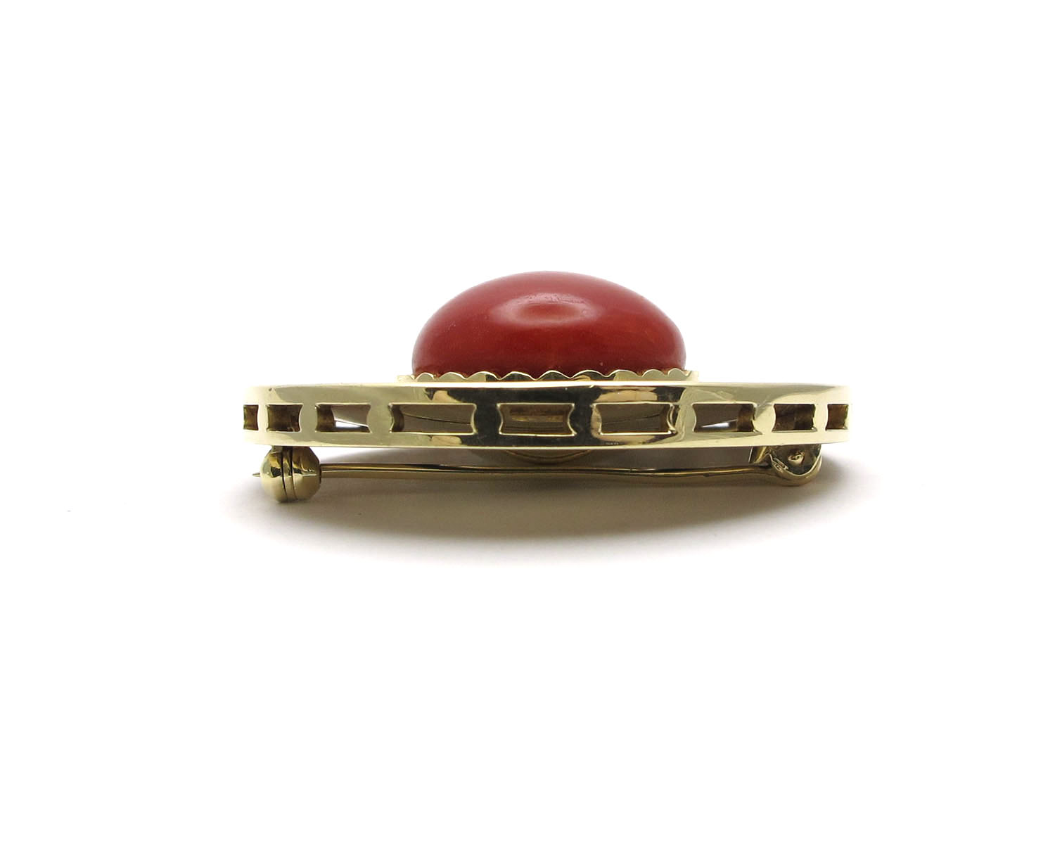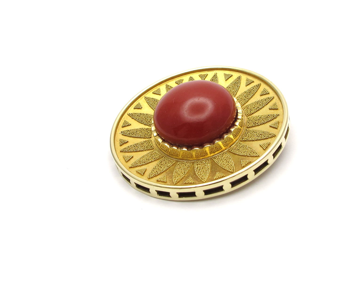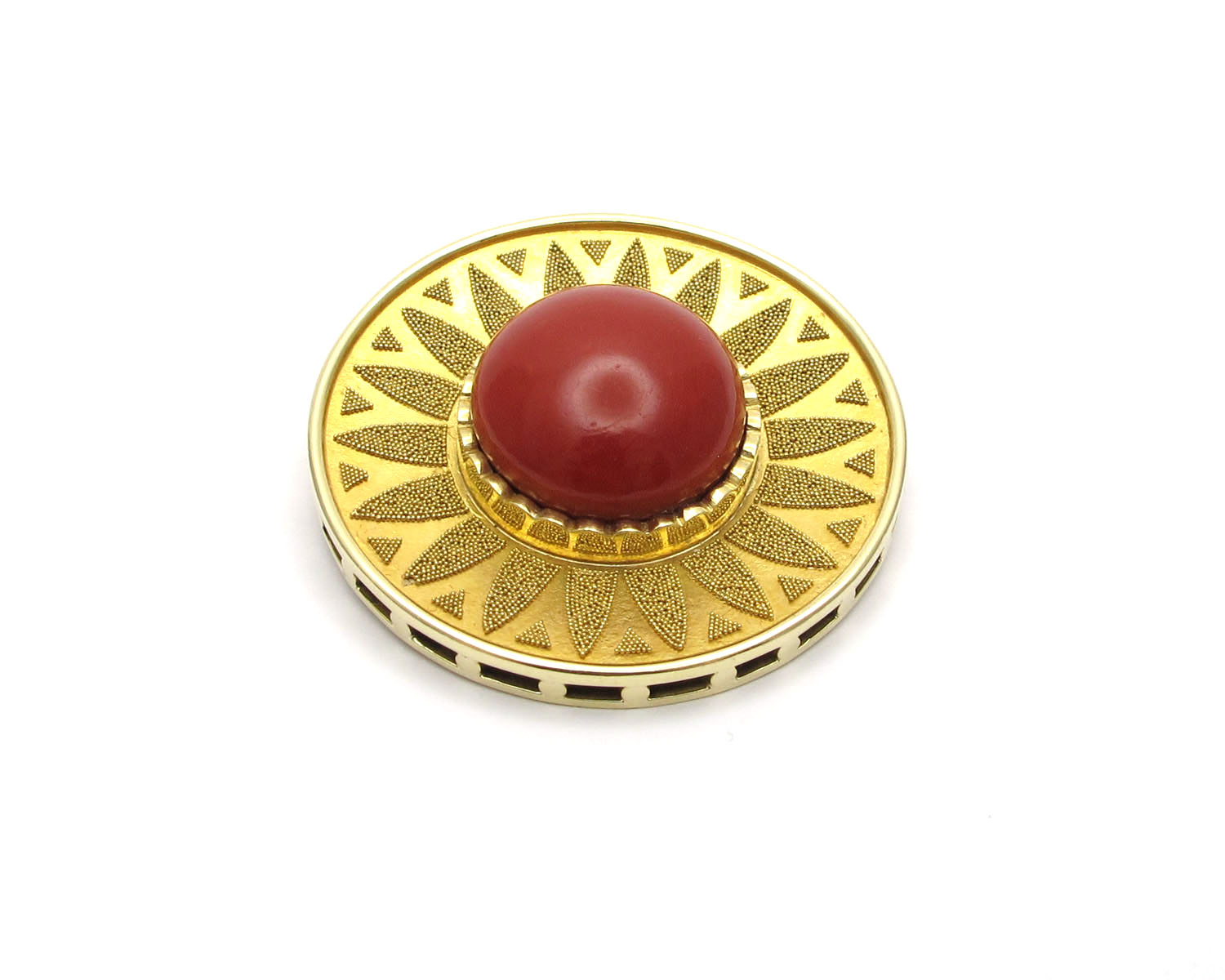| Maße: | ca. 41,3 mm Ø Koralle mit Fassung ca. 20,9 mm Ø Koralle ca. 18,7 mm Ø (in der Fassung gemessen) |